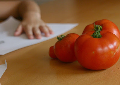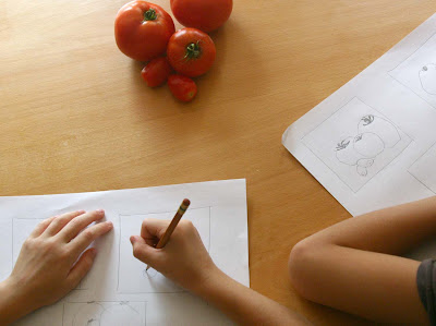 Encourage the kids to look at the true shape of things, meaning not what their brain says they should see but, rather, what they are actually seeing. Our minds register "tomato" as bulbous and round in shape, but their shapes can be quite varied. Point out irregularities in objects, and encourage your kids to include those. We (and especially kids) tend to want to draw the "idea" of a certain object, rather than what we are really seeing. A college art teacher of mine used to always say, "draw with your eyes, not with your brain."
